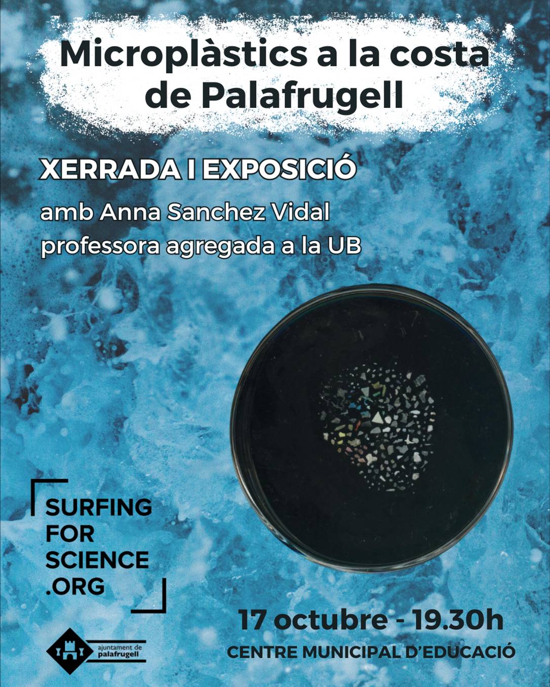 Xerrada Microplàstics a prop de casa: resultats preliminars d’un any de recollida de mostres a Palafrugell. Projecte Surfing for Science. A càrrec d’Anna Sánchez Vidal, professora agregada a la UB i investigadora del projecte Surfing for Science. Àrea de Medi Ambient, AVAC, Tourist Service i xarxa de voluntaris