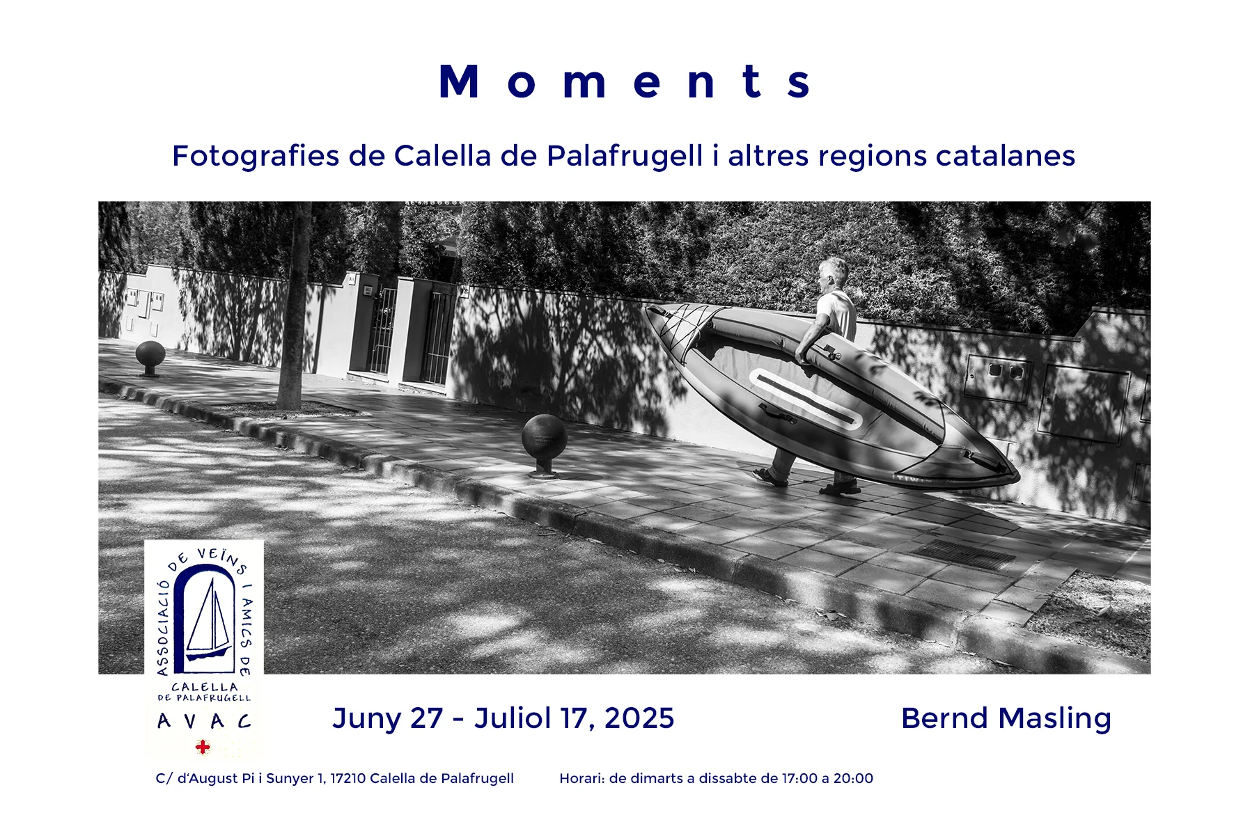 19.00 h. Local Social de l’AVAC de Calella. Inauguració de l’exposició Moments. Fotografies de Calella i altres regions catalanes, de Bernd Masling. Fins al 17 de juliol de 2025. Associació de Veïns i Amics de Calella. Festa Major de Calella de Palafrugell 2025.