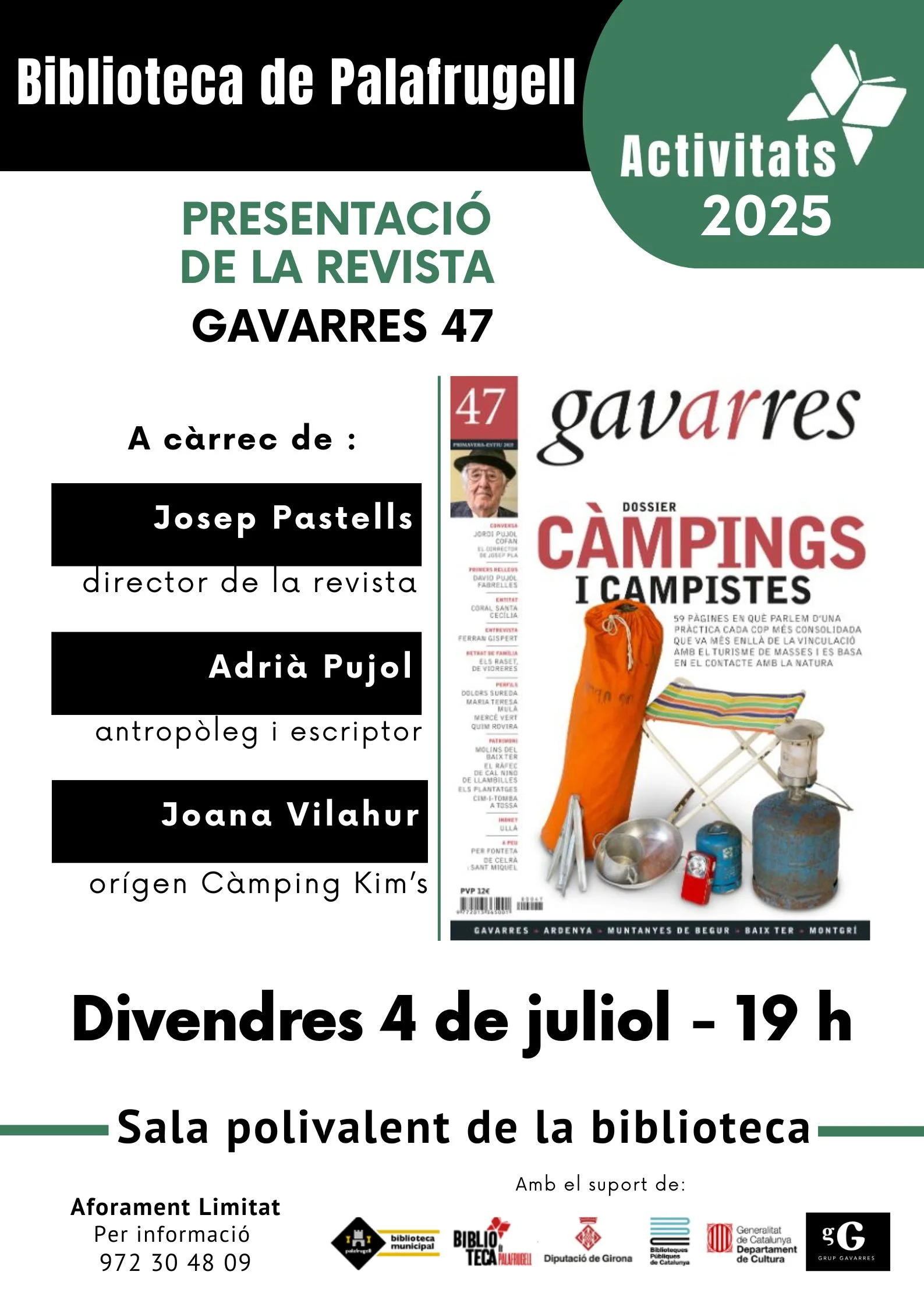 Presentació del número 47 de la Revista Gavarres: Càmpings i campistes. A càrrec de Josep Pastells, director de la revista Gavarres; Adrià Pujol, antropòleg i escriptor, i Joana Vilahur, filla dels fundadors del càmping Kim's de Llafranc.